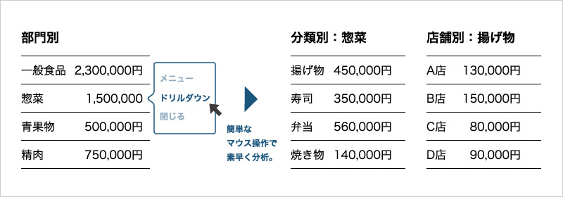 | 時間帯分析 | ・時間帯部門分析 ・時間帯単品分析 ・比較時間帯分析 ・単品時系列分析 |
