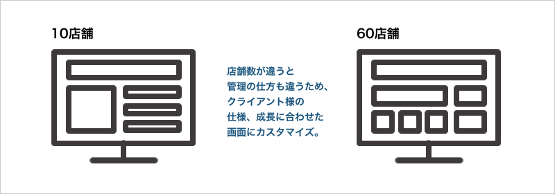10店舗前後の企業様と60店舗を超える企業様、同一の画面では本部業務の生産性が上がりません。AKRSは店舗数に応じて画面を変更し、クライアント企業の成長にも対応します。