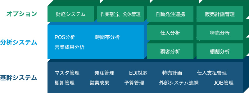 | その他分析オプション | ・特売分析 ・仕入分析 ・顧客分析 ・棚割分析 ・ベスト分析 |